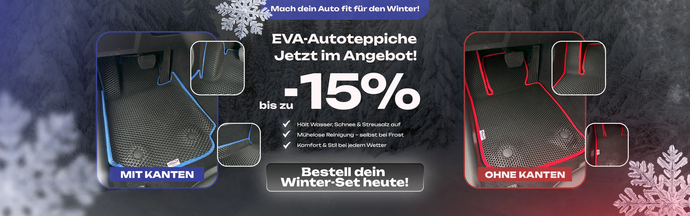 EVA-Automatten vereinen die Vorteile traditioneller Gummi- und Textilmatten: Sie sind leicht, robust, geruchsneutral und pflegeleicht. Dank der speziellen Struktur wird Schmutz sicher aufgenommen, sodass Ihr Fahrzeug stets sauber und ordentlich bleibt.